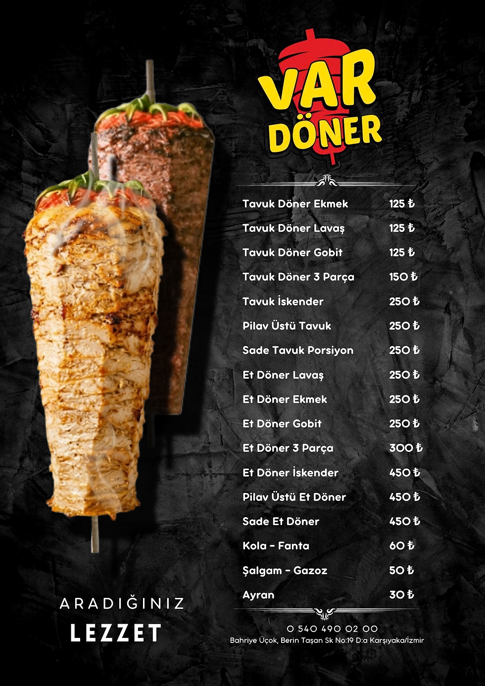 Var Döner’in menüsünde günlük öğünler için ideal pek çok seçenek yer alıyor. Tavuk döner tarafında ekmek arası, lavaş ve gobit gibi klasik tercihler öne çıkarken; daha doyurucu bir öğün isteyenler için pilav üstü tavuk döner ve tavuk iskender gibi alternatifler bulunuyor. Et döner sevenler için de yine benzer şekilde ekmek arası, lavaş, gobit, pilav üstü et döner ve et iskender seçenekleri sunuluyor. Böylece ister hızlı bir atıştırmalık ister daha dolu bir öğün tercih edilsin, menü içinde herkese uygun bir alternatif bulmak mümkün oluyor. Bu menüyü daha da cazip hale getiren unsur ise Neredeyse üzerinden sunulan kampanya fırsatları.