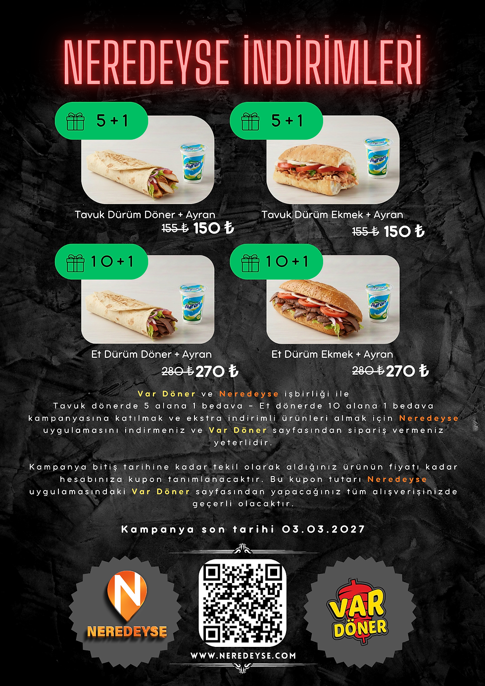 Var Döner x Neredeyse iş birliğiyle avantajlı döner siparişi (03.03.2027 son tarih)